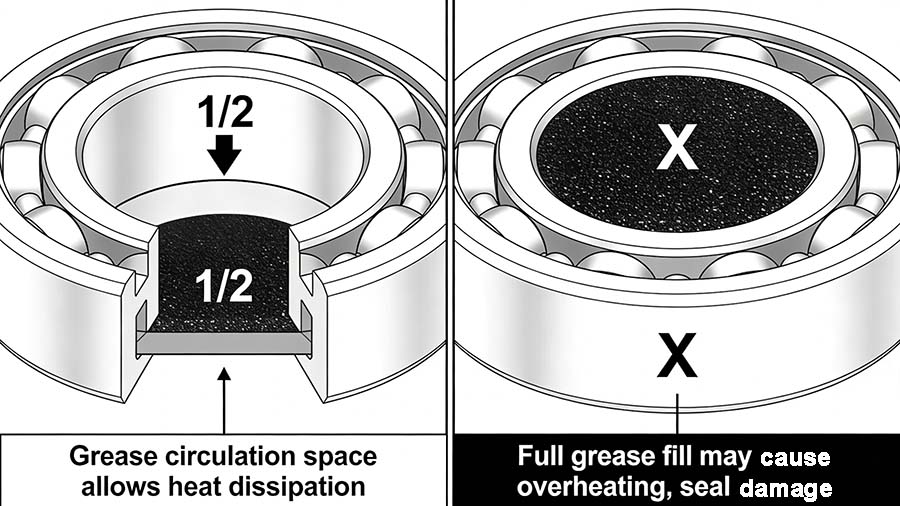 Bearing cavities do not necessarily need to be completely filled. In some crane parts, packing the entire cavity with grease can actually accelerate bearing failure. The main reasons are: